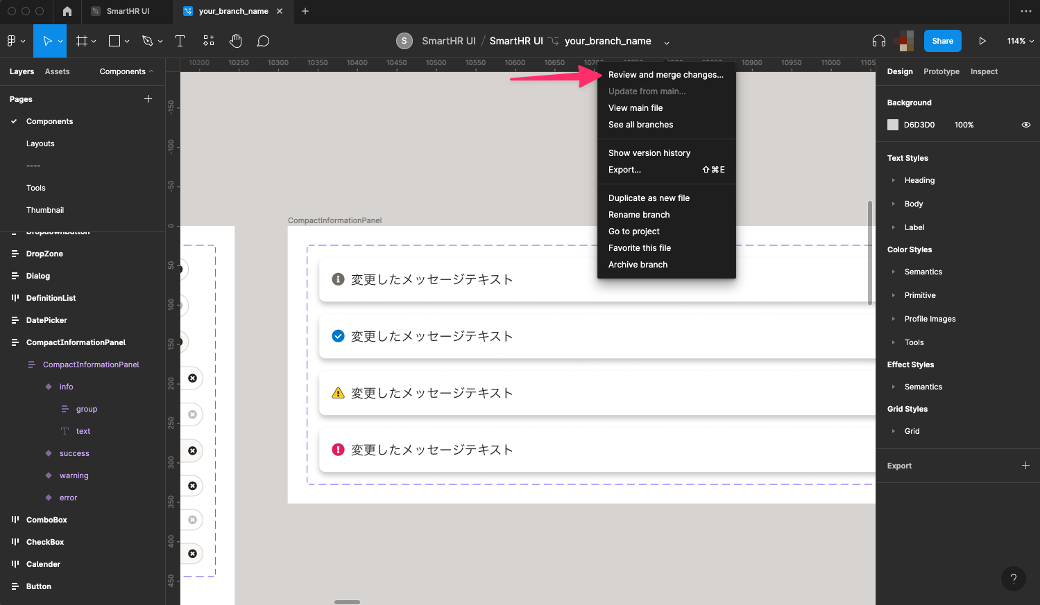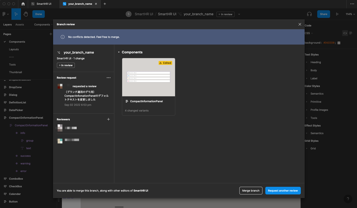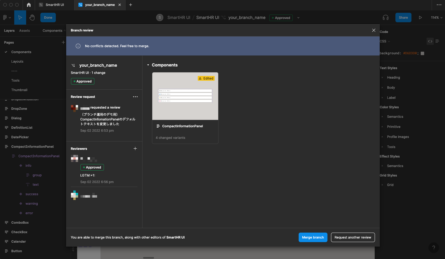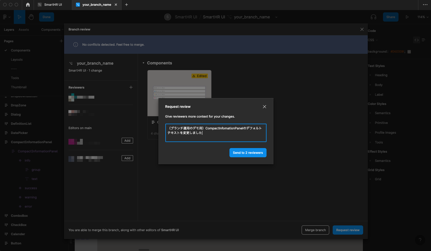 • Text StyleやColor Styleの変更など、必然的に影響範囲が大きくなる場合はその旨をブランチの説明に明記してください。
