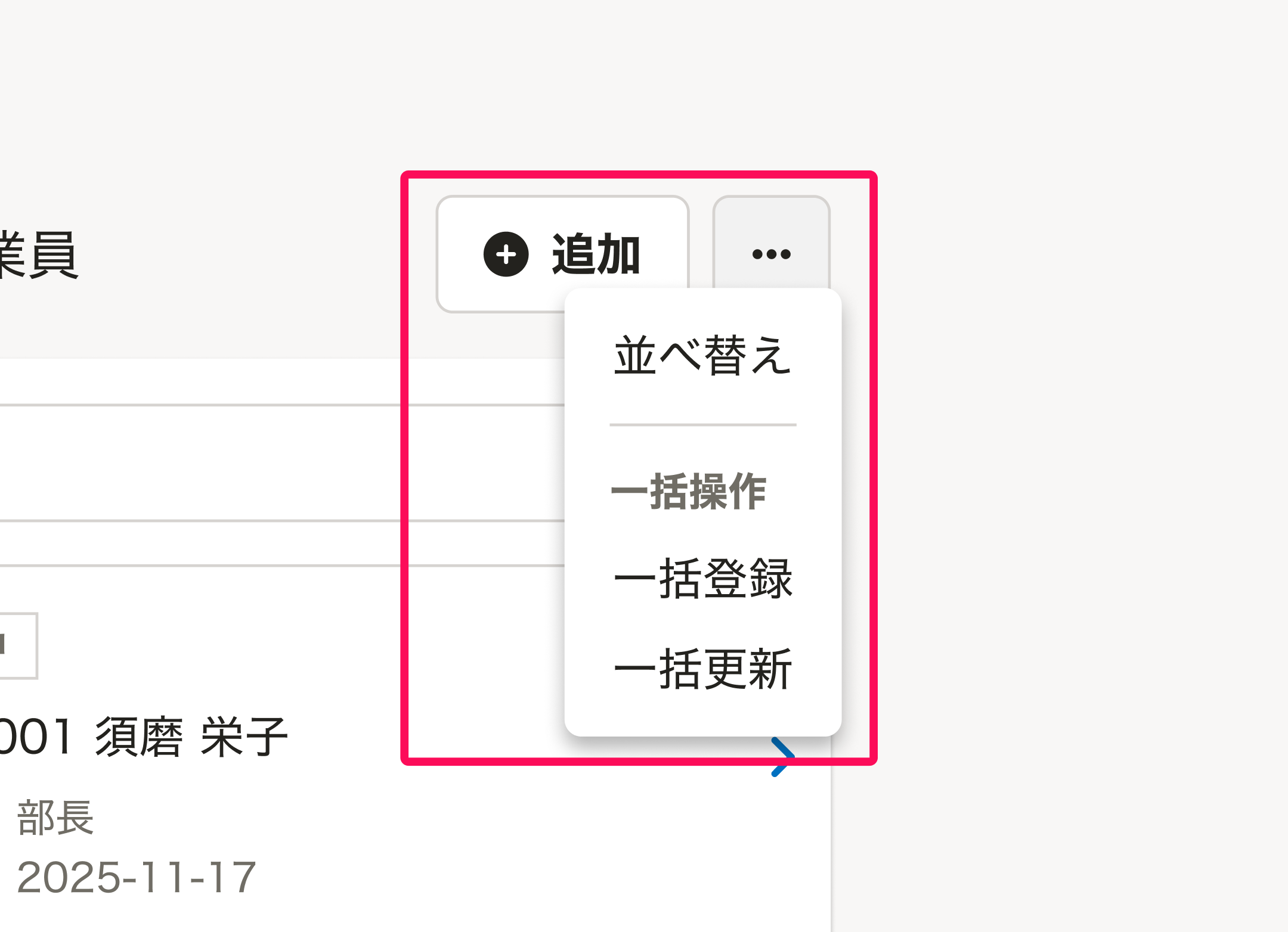 以下に限らず、扱う機能やユースケースによって、データの追加・一括変更などに関わるアクションボタンを配置できます。