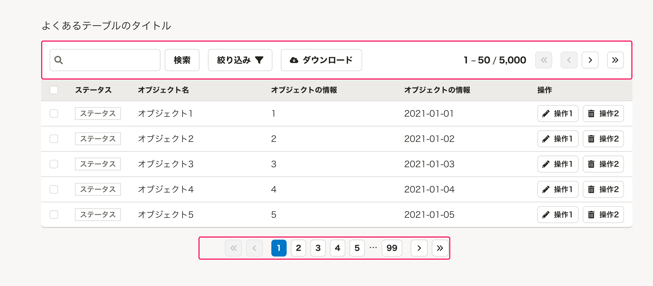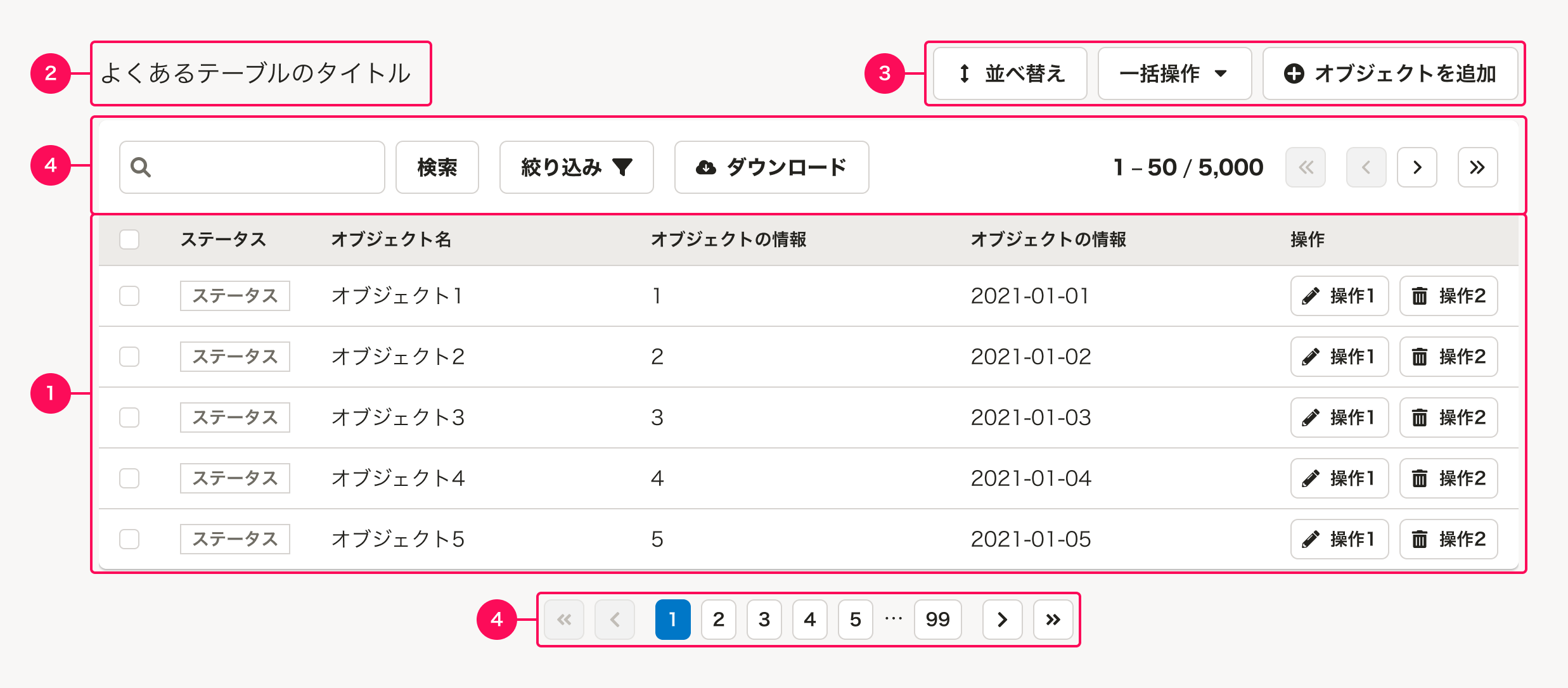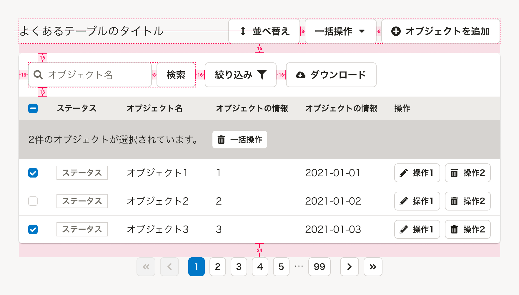 テーブルのページ送り-テーブルのオブジェクトの量(行数)が多くなる場合に、複数のページに分けてPaginationを配置します。