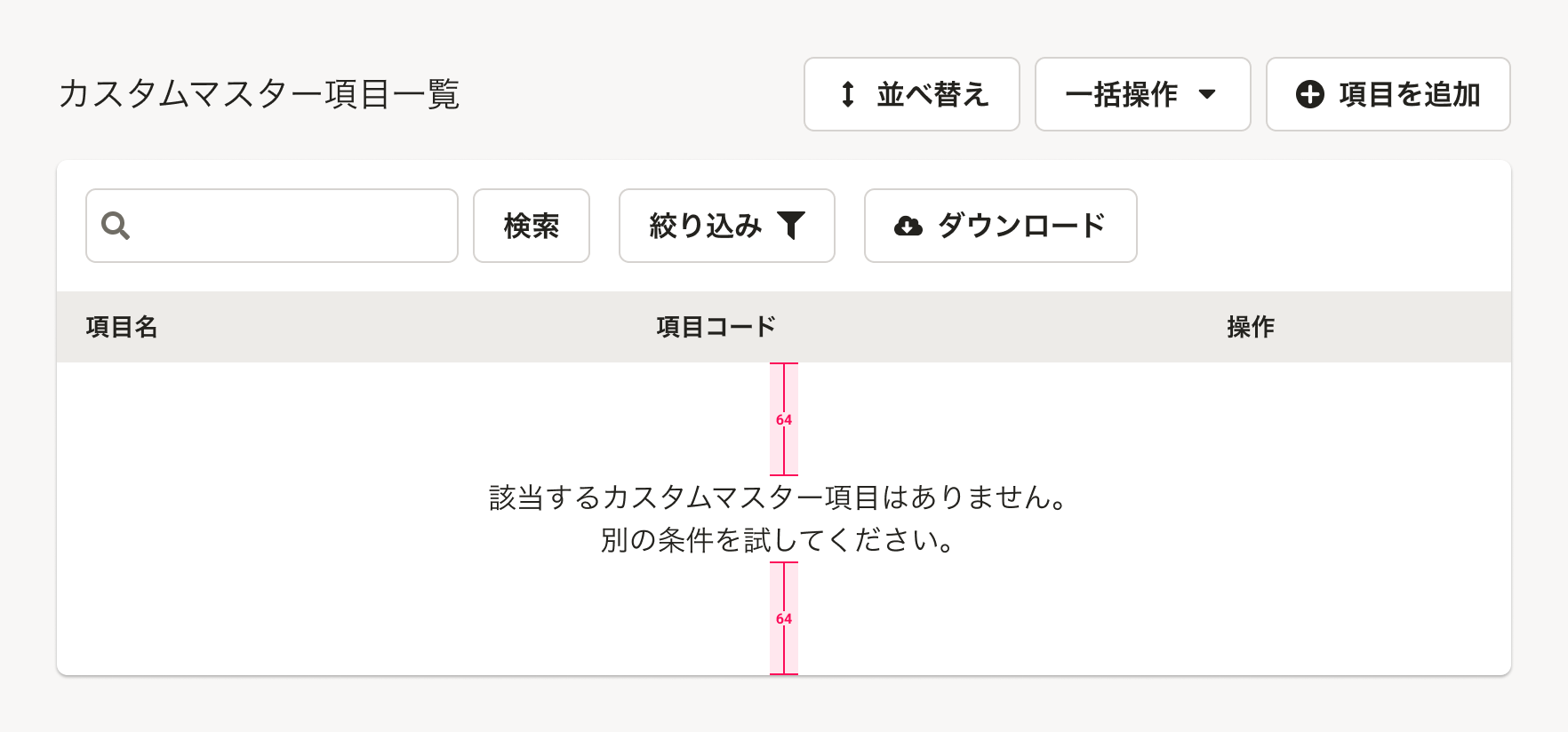 • オブジェクトがないと成立しないアクションボタン(並べ替え, 一括更新(CSV))は非表示とします。